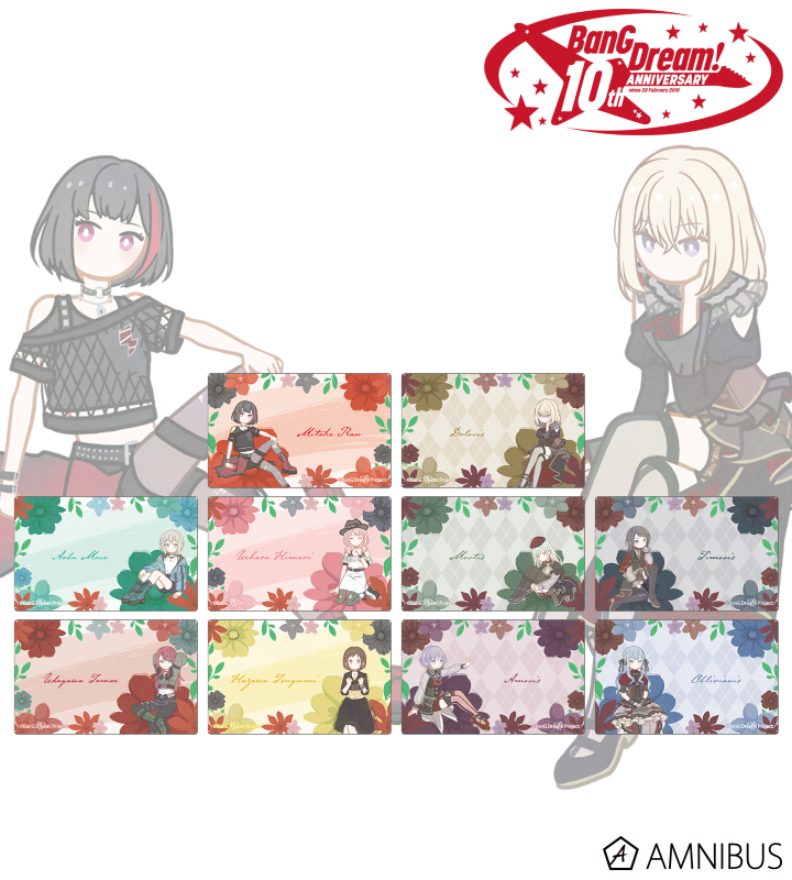 美竹 蘭、青葉 モカ、上原 ひまり、宇田川 巴、羽沢 つぐみ、ドロリス、モーティス、ティモリス、アモーリス、オブリビオニスのイラストをボタニカルデザインに落とし込んで繊細なタッチで新たに描き起こし、カードステッカーに仕上げました。