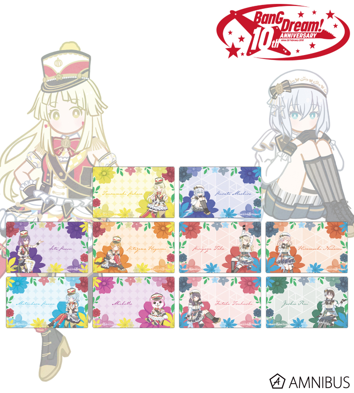 弦巻 こころ、瀬田 薫、北沢 はぐみ、松原 花音、ミッシェル、倉田 ましろ、桐ヶ谷 透子、広町 七深、二葉 つくし、八潮 瑠唯のイラストをボタニカルデザインに落とし込んで繊細なタッチで新たに描き起こし、カードステッカーに仕上げました。