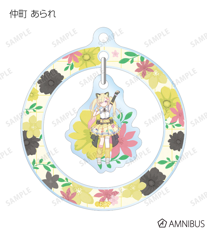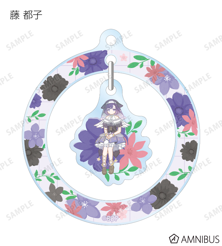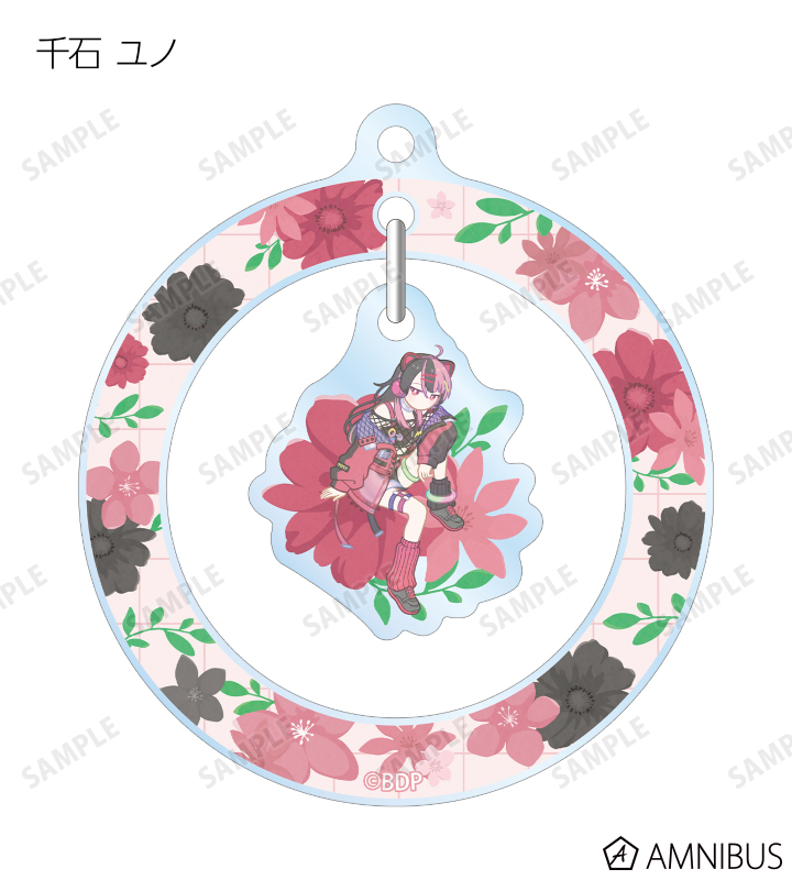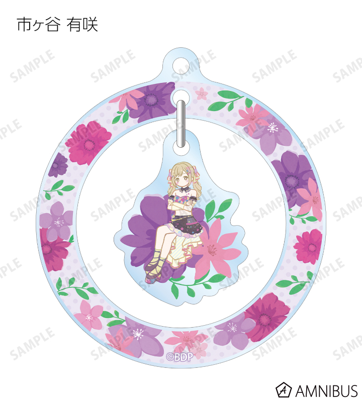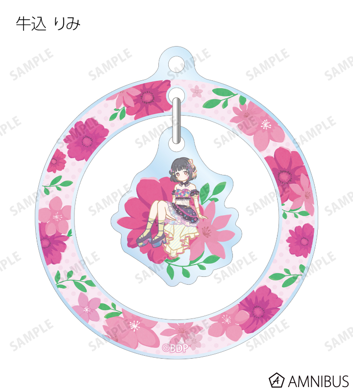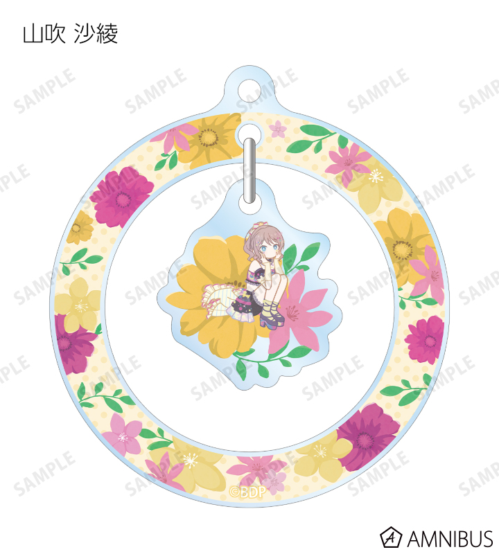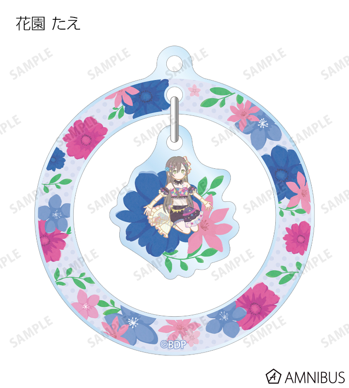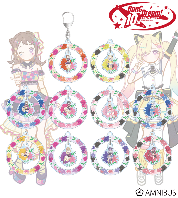 戸山 香澄、花園 たえ、牛込 りみ、山吹 沙綾、市ヶ谷 有咲、仲町 あられ、宮永 ののか、峰月 律、藤 都子、千石 ユノのイラストをボタニカルデザインに落とし込んで繊細なタッチで新たに描き起こし、ゆらゆら動くアクリルキーホルダーに仕上げました。