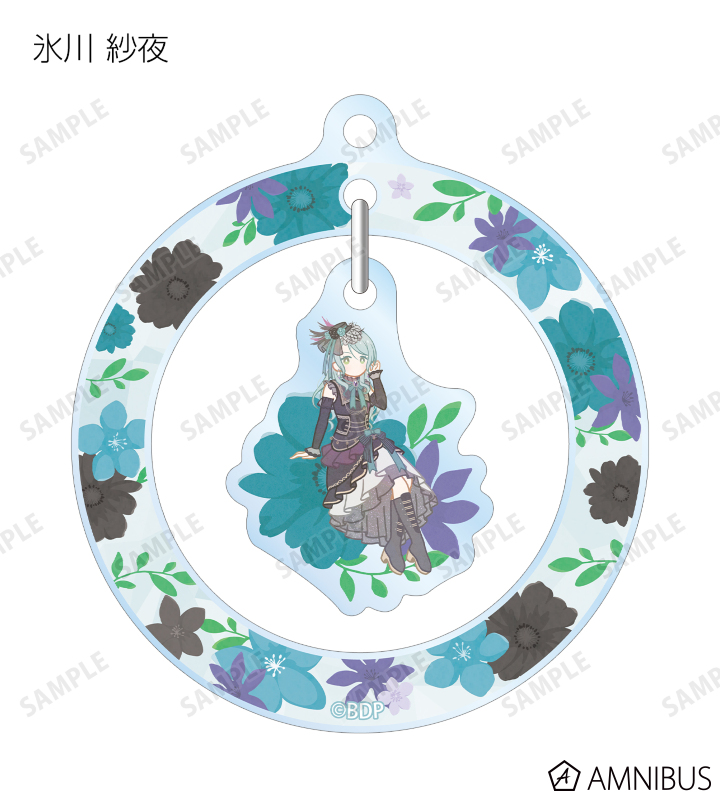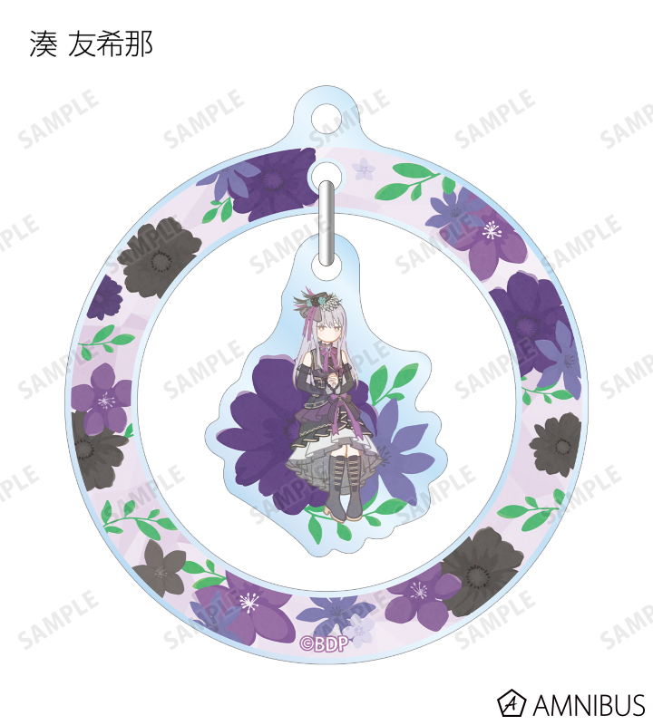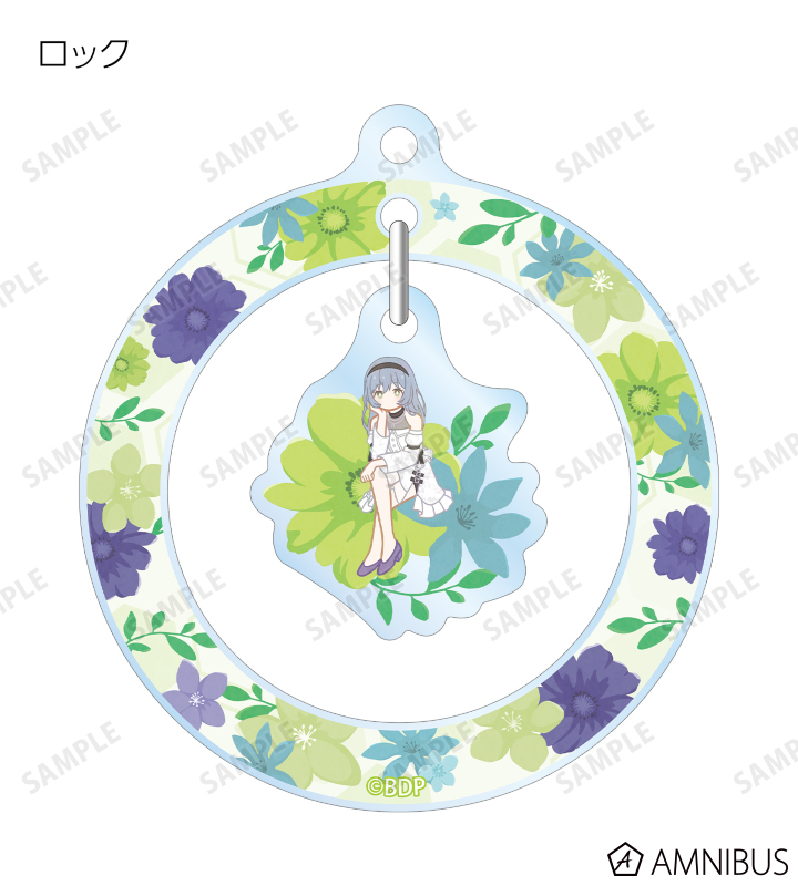 湊 友希那、氷川 紗夜、今井 リサ、宇田川 あこ、白金 燐子、レイヤ、ロック、マスキング、パレオ、チュチュのイラストをボタニカルデザインに落とし込んで繊細なタッチで新たに描き起こし、ゆらゆら動くアクリルキーホルダーに仕上げました。