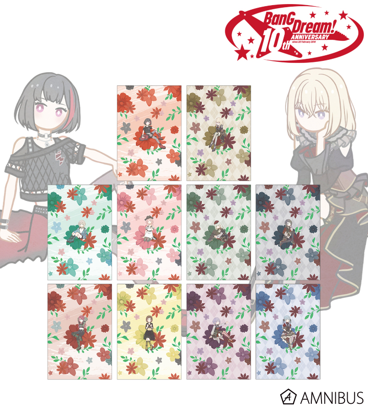美竹 蘭、青葉 モカ、上原 ひまり、宇田川 巴、羽沢 つぐみ、ドロリス、モーティス、ティモリス、アモーリス、オブリビオニスのイラストをボタニカルデザインに落とし込んで繊細なタッチで新たに描き起こし、ポストカードに仕上げました。