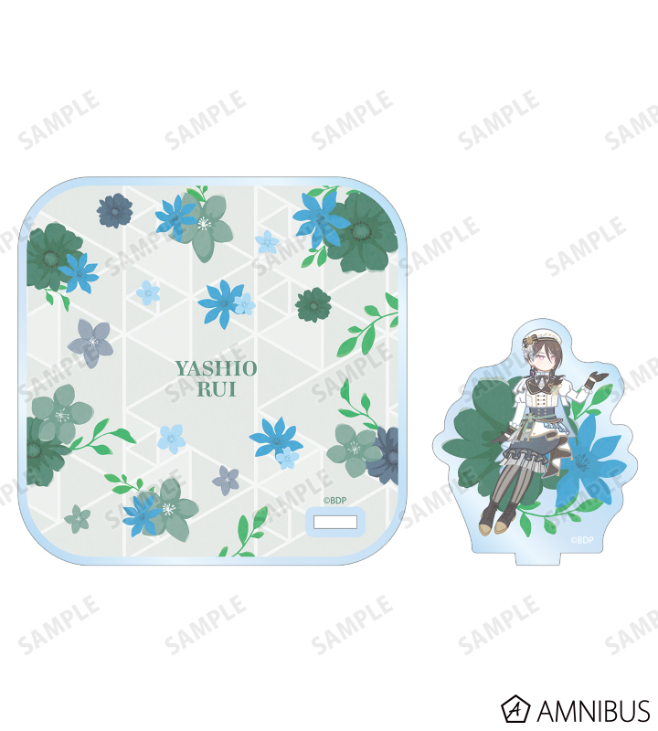 八潮 瑠唯のイラストをボタニカルデザインに落とし込んで繊細なタッチで新たに描き起こし、アクリルスタンド付きコースターに仕上げました。