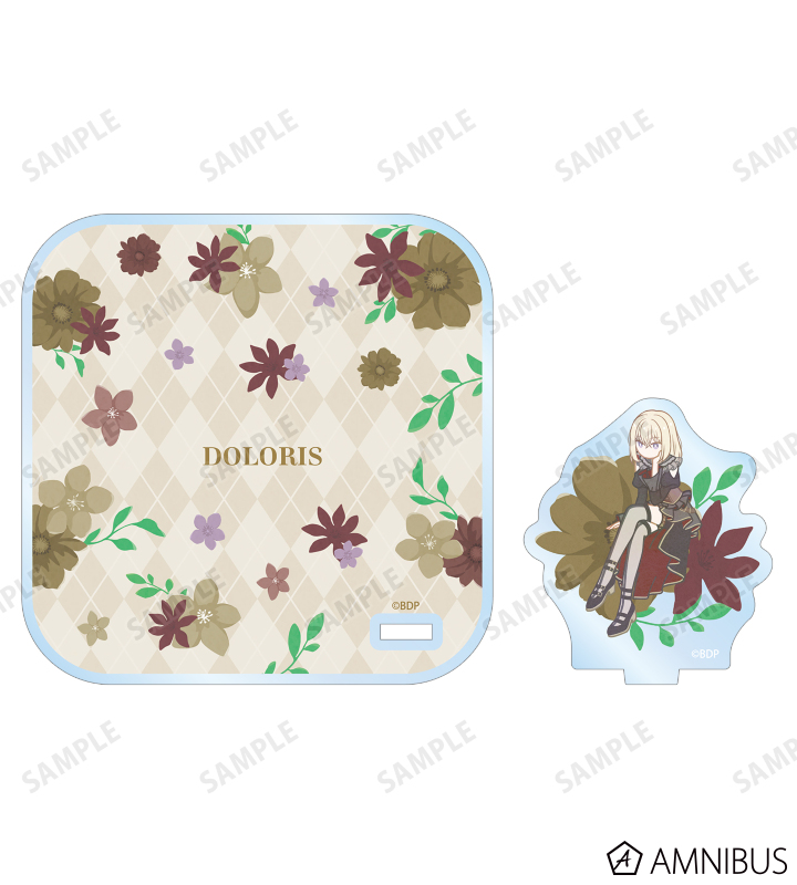 ドロリスのイラストをボタニカルデザインに落とし込んで繊細なタッチで新たに描き起こし、アクリルスタンド付きコースターに仕上げました。