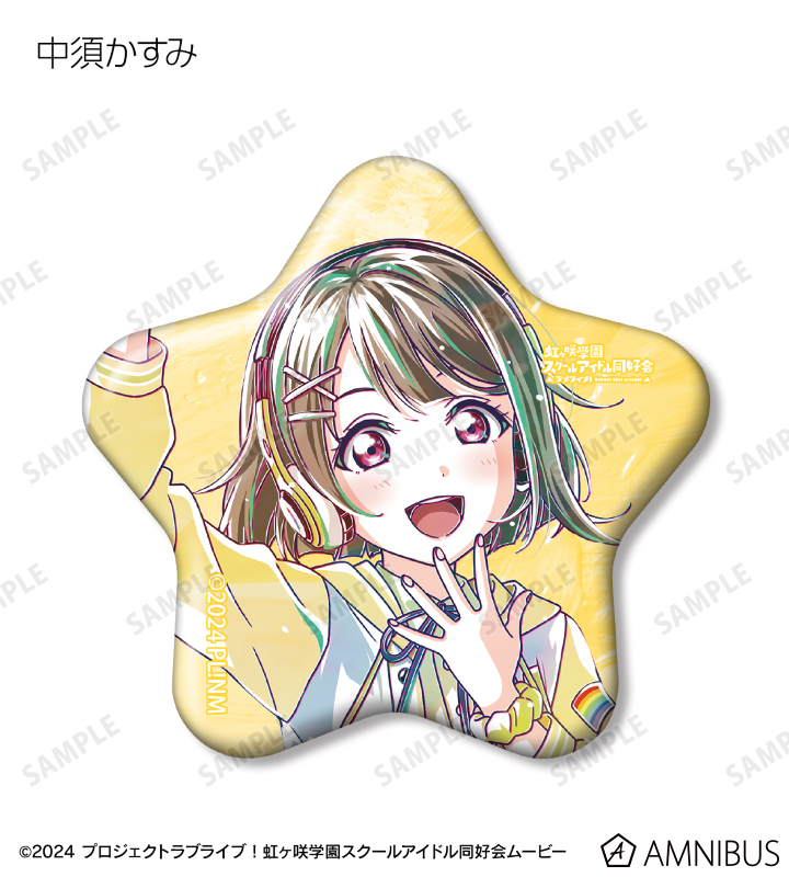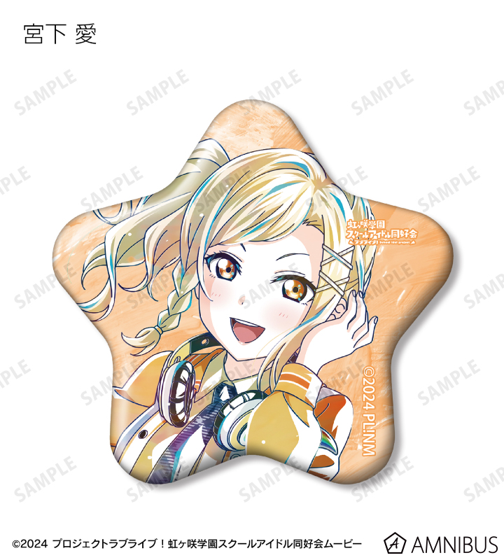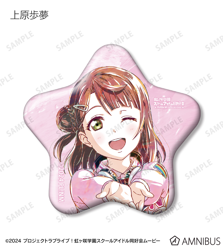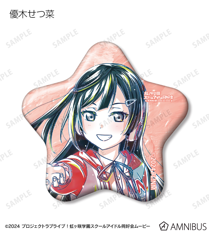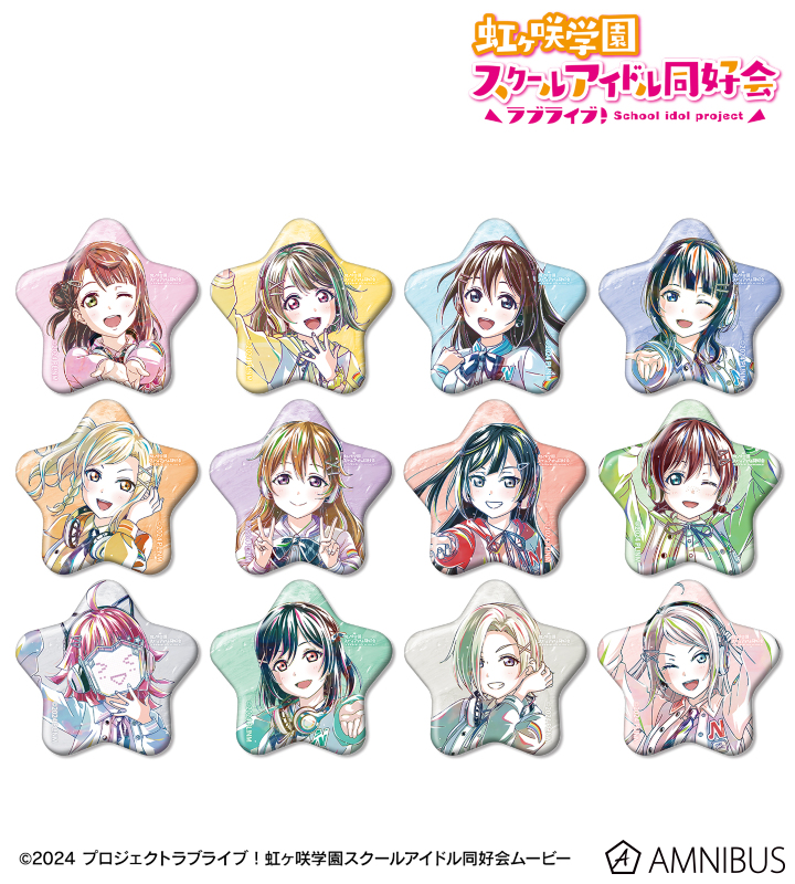 上原歩夢、中須かすみ、桜坂しずく、朝香果林、宮下 愛、近江彼方、優木せつ菜、エマ・ヴェルデ、天王寺璃奈、三船栞子、ミア・テイラー、鐘 嵐珠の描き下ろしイラストを新たなタッチで魅力的に表現し、星型の缶バッジに仕上げました。