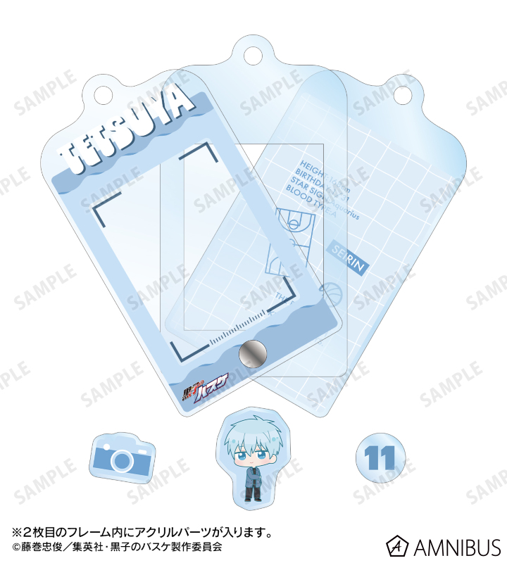 アクリルフレームの中に、黒子テツヤ、黄瀬涼太、緑間真太郎、青峰大輝、紫原 敦、赤司征十郎の描き起こしちびキャライラストの小さなパーツが入っている、パーツ付きフレームアクリルチャームです。