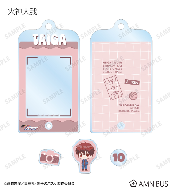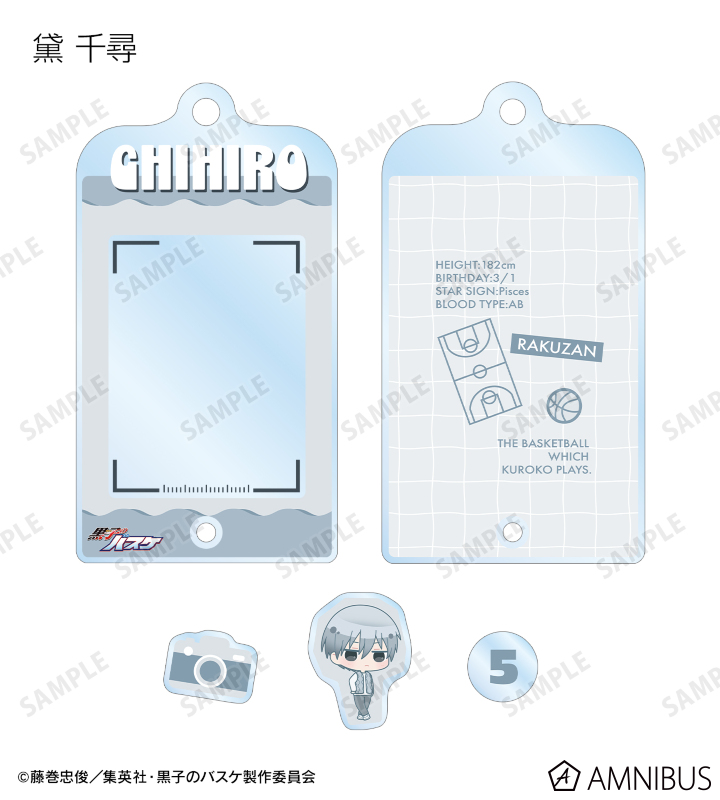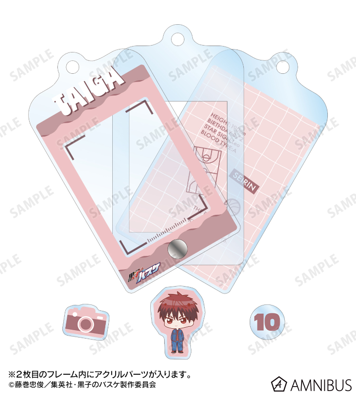 アクリルフレームの中に、火神大我、笠松幸男、高尾和成、今吉翔一、氷室辰也、黛 千尋の描き起こしちびキャライラストの小さなパーツが入っている、パーツ付きフレームアクリルチャームです。