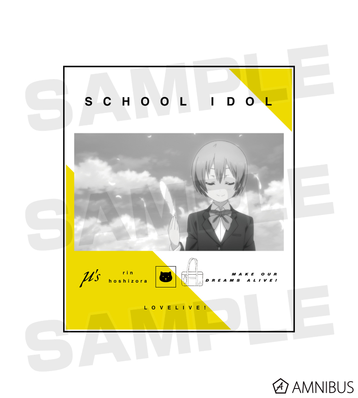 TVアニメ2期 EDテーマ「どんなときもずっと」より、羽を持つ星空 凛のワンシーンとμ'sのロゴマークや練習着のイラスト、学校カバンなどのモチーフをレイアウトして、メンバーからイメージしたカラーリングで仕上げています。