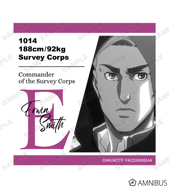 エルヴィンと名前や誕生日、身長体重などのパーソナル情報をレイアウトし、キャラクターからイメージしたカラーリングで仕上げました。