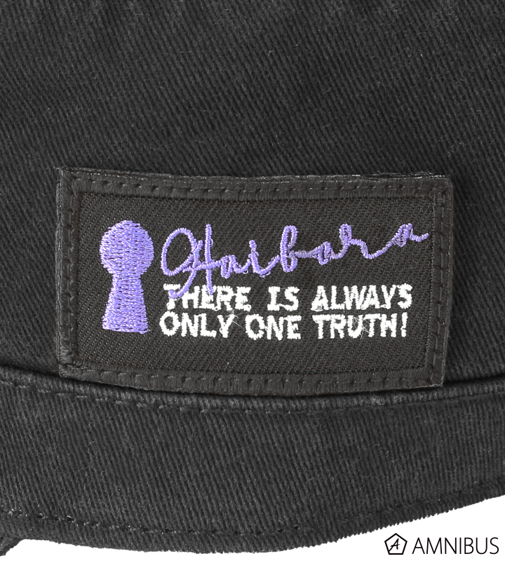 ツバの部分にはアイコンマークや作品タイトルなどを組み合わせたデザインのステッカーを貼り付けています。