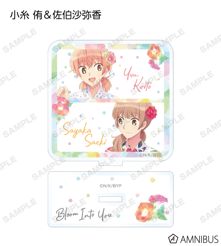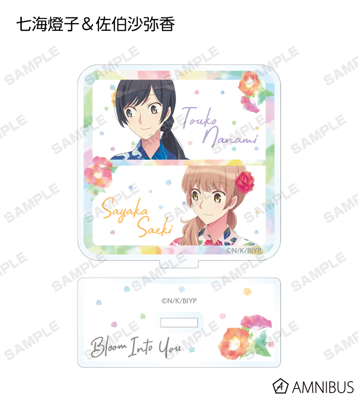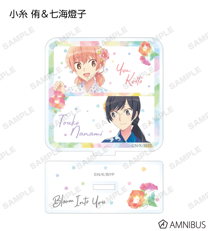 AMNIBUS STOREで開催された「『やがて君になる』POP UP SHOP in AMNIBUS STORE ~2020 夏祭り~」描き下ろしイラストの浴衣姿の小糸 侑、七海燈子、佐伯沙弥香を名前や朝顔の花のモチーフと合わせて、夏祭りをイメージしたデザインに仕上げています。