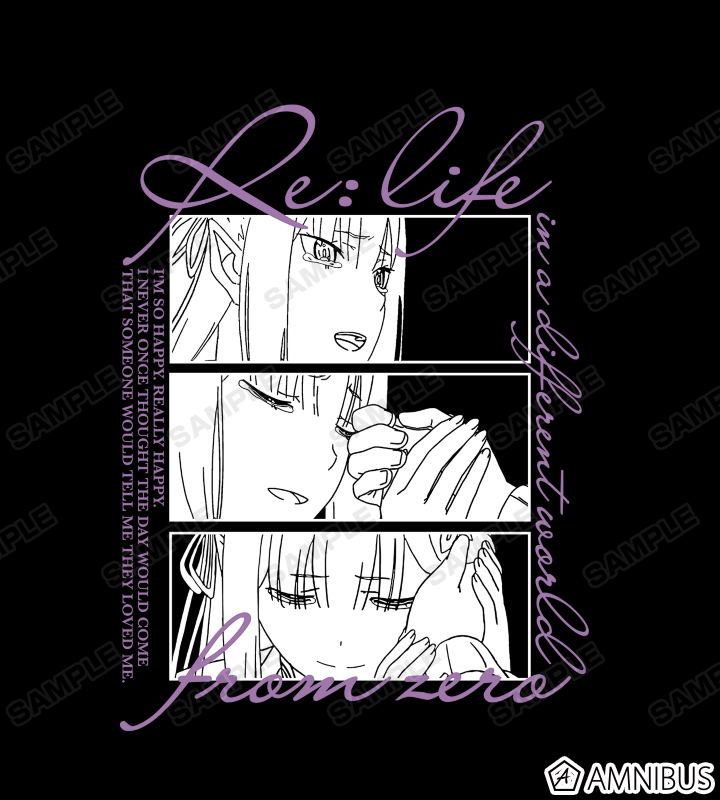エミリアと作品タイトル、「ーーー嬉しい。本当に、嬉しい。誰かに好きだなんて、言ってもらえる日がくるなんて考えた事もなかったから」の英訳を組み合わせたデザインを背面にレイアウトしました。