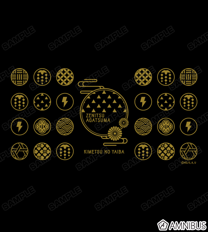 我妻善逸の羽織の柄、雷の模様、日輪刀の鍔、藤の花などを和風のモチーフと合わせてレイアウトしたデザインに仕上げています。