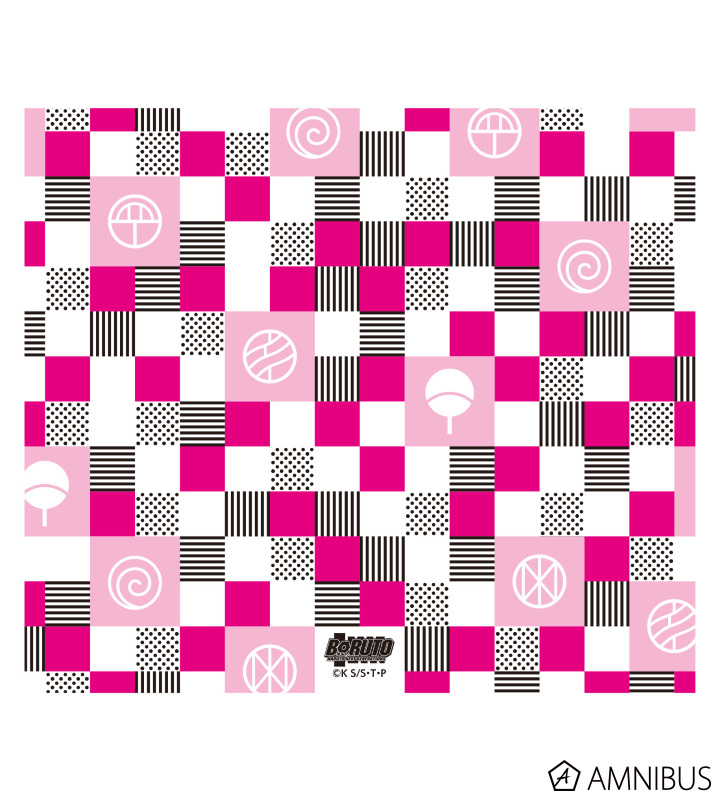 「うずまきボルト」「うちはサラダ」「奈良シカダイ」「山中いのじん」「秋道チョウチョウ」の五人の一族の家紋を、ドットやストライプの柄と共にピンクでデザインし、ボルトたち次世代の元気さや可愛らしさを表現しました。