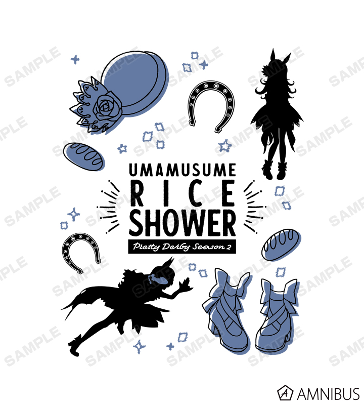 ライスシャワーの勝負服や蹄鉄、パンなどのモチーフをラインに起こし、文字やカラーリングを織り交ぜて、魅力的に表現しました。