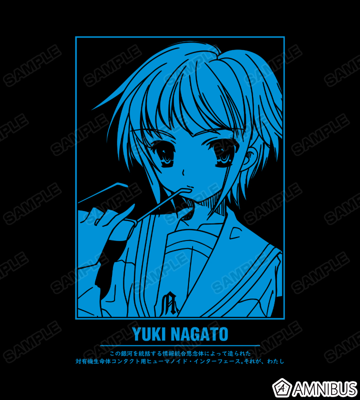 長門有希と名前、印象的なセリフを合わせて背面にレイアウトし、胸元には県立北高校の校章をあしらっています。