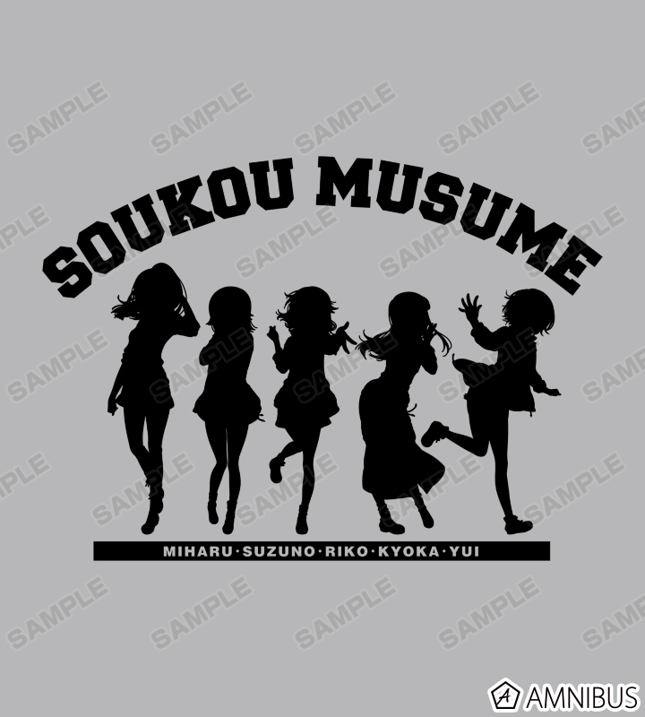 リコ、ユイ、キョウカ、スズノ、ミハルのシルエットや名前、作品タイトルを組み合わせて、カレッジ風のデザインに仕上げました。