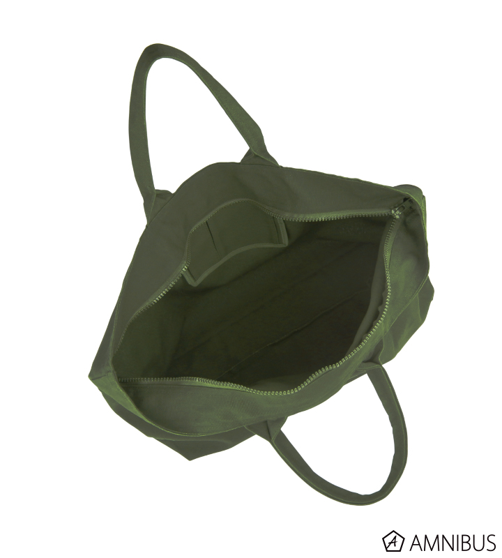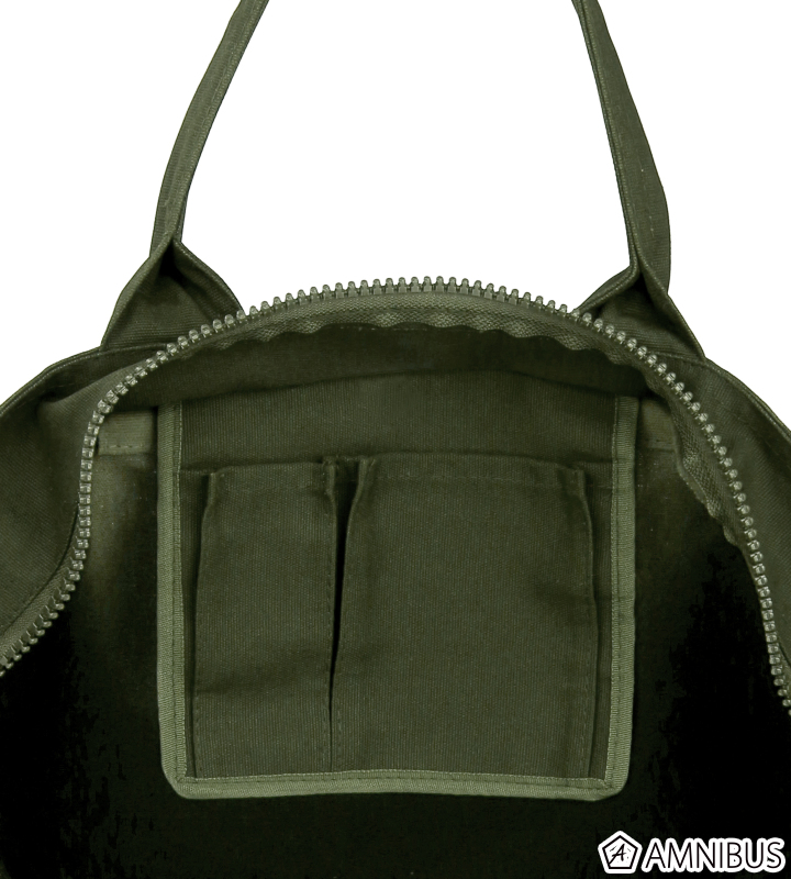 厚みのある生地で、開け口にはジッパーがつき、大容量の収納に適しています。