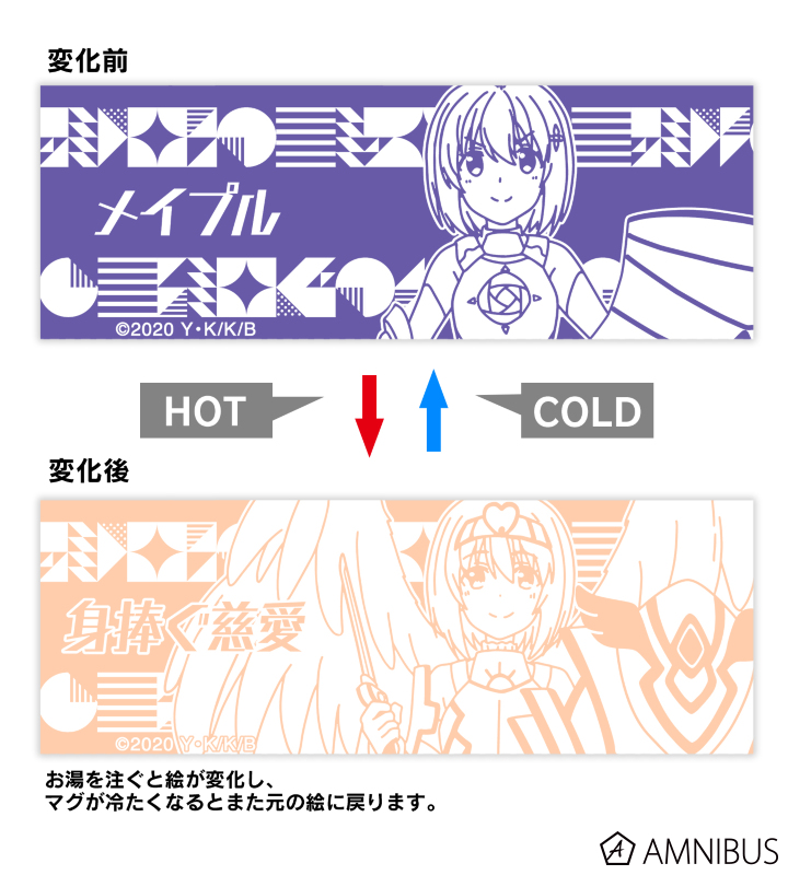 温度に反応する特殊なインクを使用しており、マグカップに温かい飲み物を入れると、通常装備のメイプルから大天使装備に身を包み【身捧ぐ慈愛】を発動したメイプルへ絵柄が変化します。