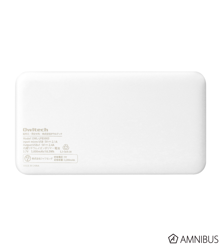 オウルテック社製の大容量5000mAhかつ高出力2.4Aの急速充電可能、さらにSmartIC搭載のためデバイスに合わせた給電がいただけるモバイルバッテリーです。