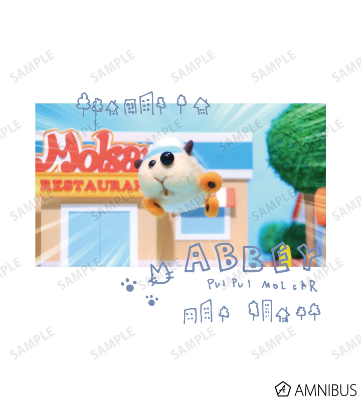 アビーの作中のシーンをメインに、手描き風のイラストや名前と合わせてレイアウトしました。