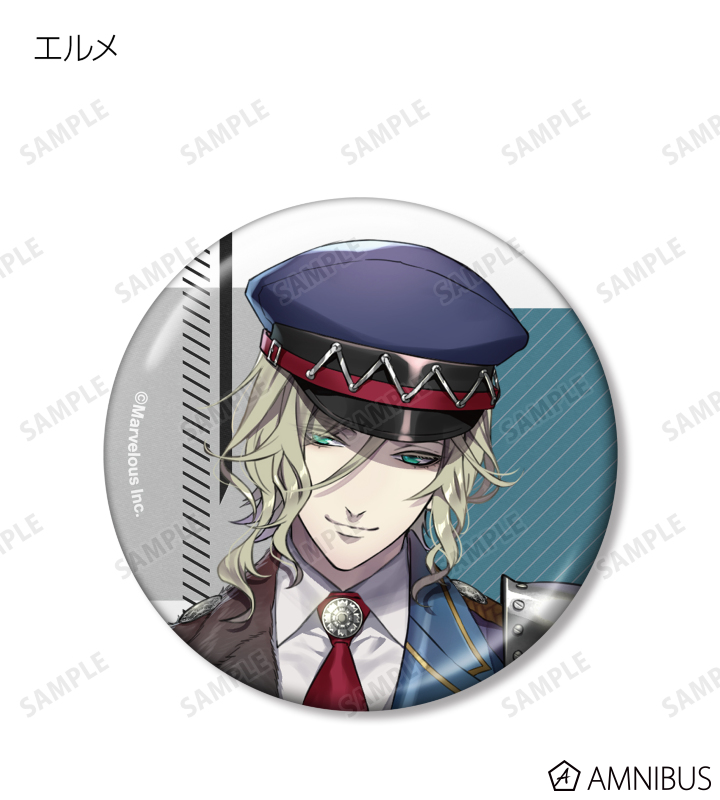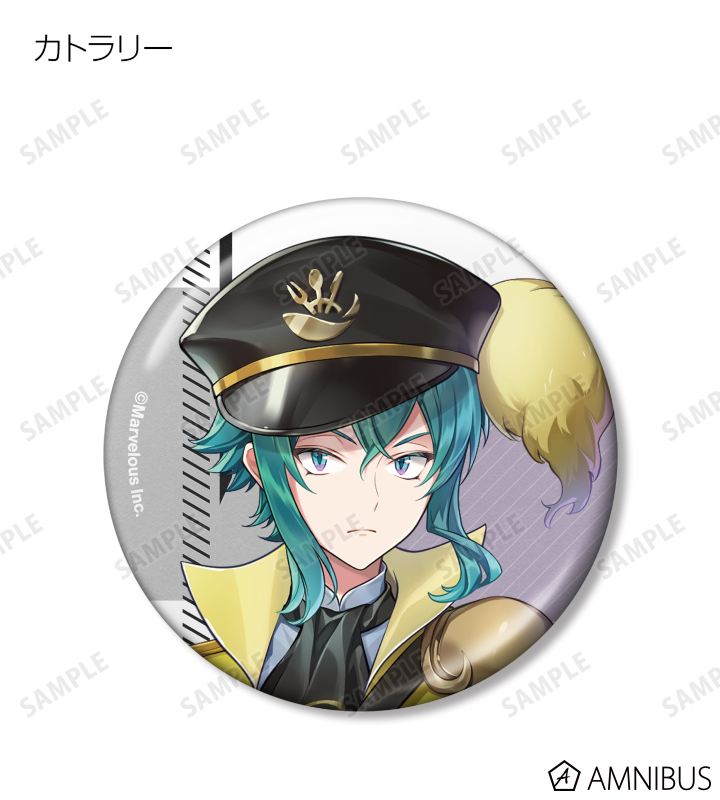 ドライゼ、エルメ、ジーグブルート、ゴースト、カール、ローレンツ、ベルガー、ファル、ミカエル、カトラリーをメインにデザインし、背景がメタリックに輝く缶バッジに仕上げました。
