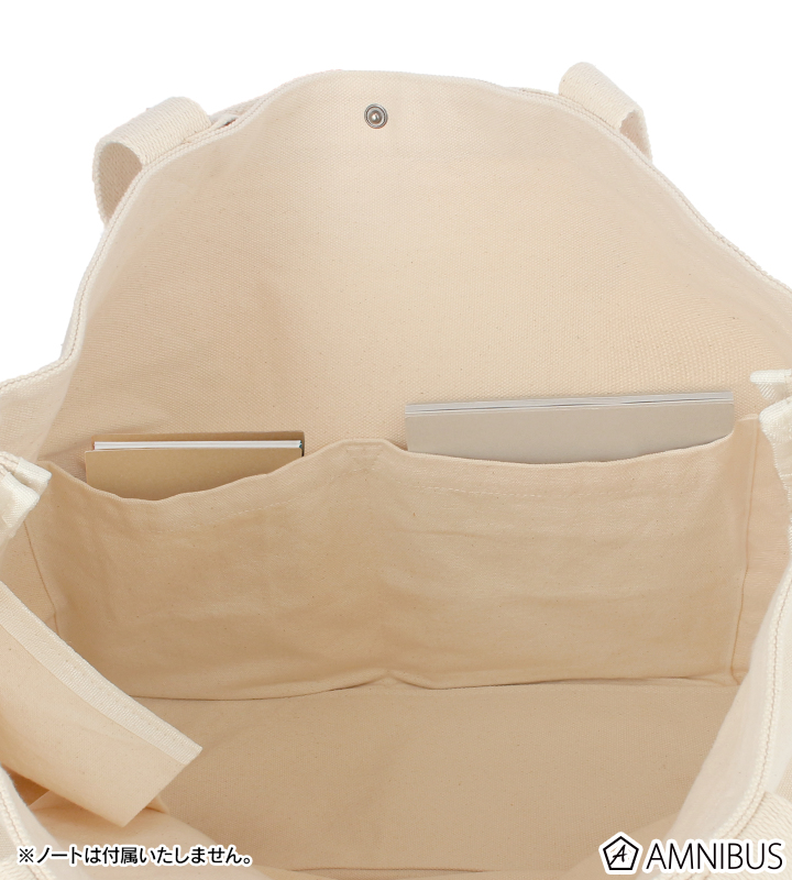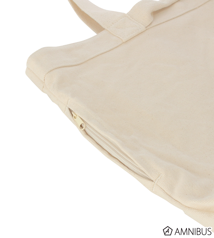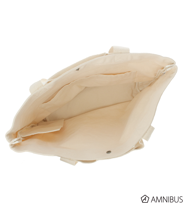 内ポケットが2つと側面にファスナー付きポケットを備えており、厚みのある生地で大容量の収納に適しています。