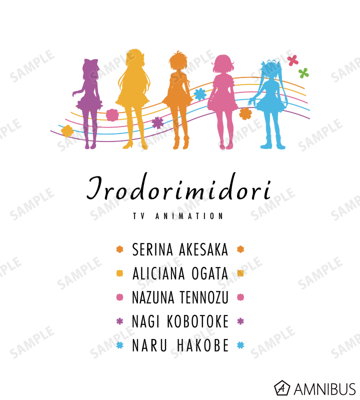 明坂 芹菜、御形 アリシアナ、天王洲 なずな、小仏 凪、箱部 なるのシルエットに名前やキャラモチーフアイコンを合わせて、イロドリミドリのバンドグッズをイメージしたデザインに仕上げました。