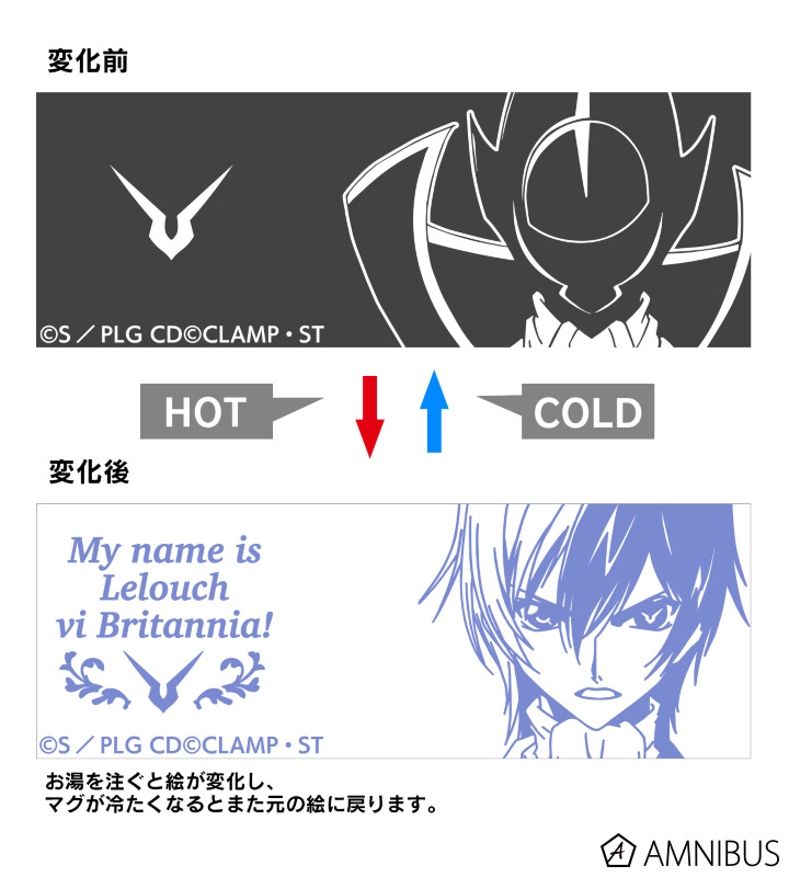温度に反応する特殊なインクを使用しており、お湯を入れるとゼロの姿から仮面を外したルルーシュが浮かび上がるデザインに仕上げました。