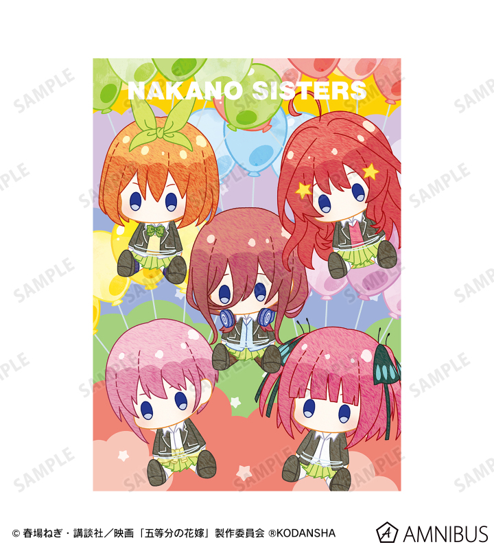 一花、二乃、三玖、四葉、五月をお空に風船でぷかぷかと浮いたぬいぐるみをイメージして描き起こしました。
