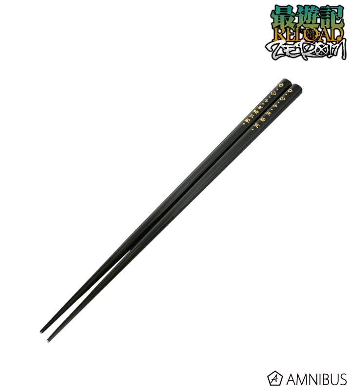 黒の箸に金プリントで玄奘三蔵と孫悟空の名前やそれぞれを表す数字などを施しました。