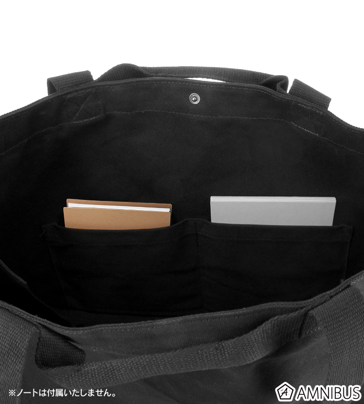 内ポケットが2つと側面にファスナー付きポケットを備えており、厚みのある生地で大容量の収納に適しています。
