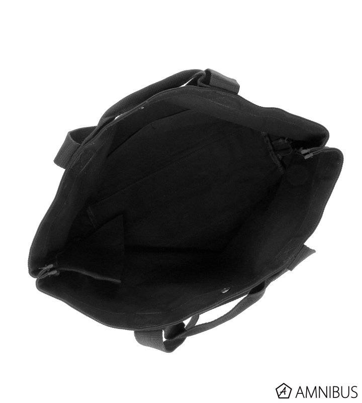 内ポケットが2つと側面にファスナー付きポケットを備えており、厚みのある生地で大容量の収納に適しています。