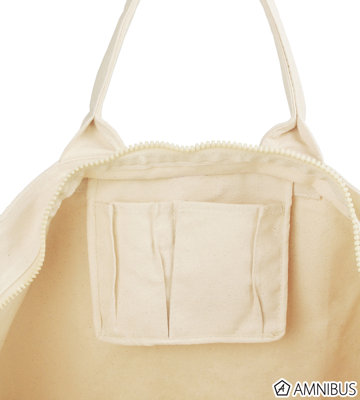 厚みのある生地で、開け口にはジッパーがつき、大容量の収納に適しています。
