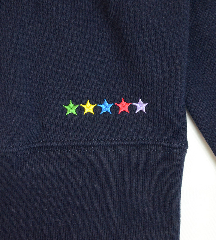 5つの星の刺繍でチームメンバー同士の繋がりの強さを、星のチャームでキャラクターを応援する心を表現したパーカーです。