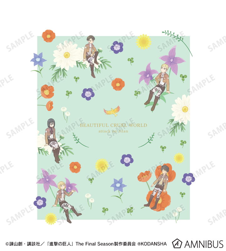 花は実際に作中に出てくる花を、鳥=自由の翼をイメージしており、兵士たちの休息を表現しているため、やさしくあたたかみのあるテイストとなっております。