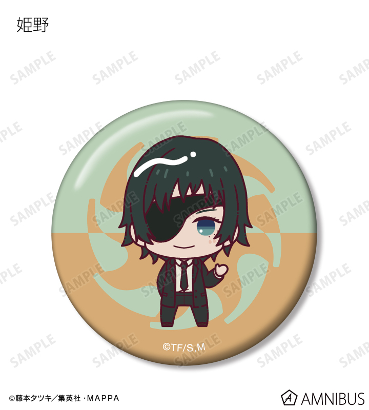 デンジ、マキマ、早川アキ、パワー、姫野、コベニ、岸辺、ポチタ、チェンソーマンがちょこんと立っているちびキャラを新たに描き起こし、缶バッジに仕上げました。