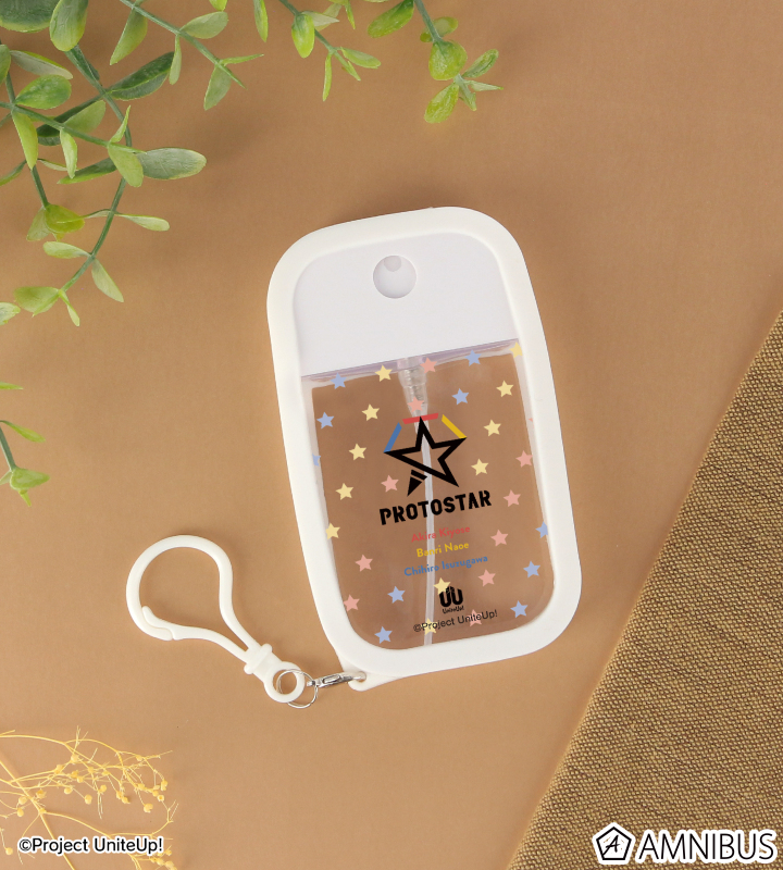 PROTOSTARのユニットロゴと、清瀬明良、直江万里、五十鈴川千紘の名前の英字表記をシリコンカバー付きスプレーボトルに仕上げました。