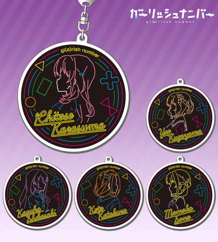 TVアニメ「ガーリッシュナンバー」に登場する烏丸千歳、久我山八重、片倉京、苑生百花、柴崎万葉を、ネオン調にデザインしたアクリルキーホルダーの登場です! 独特な雰囲気で、いつもと違う場所につけて歩くことができるかも……?!