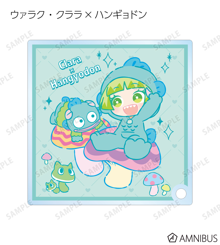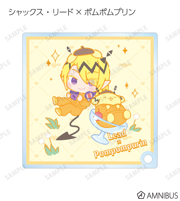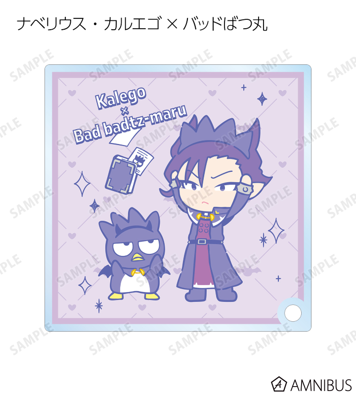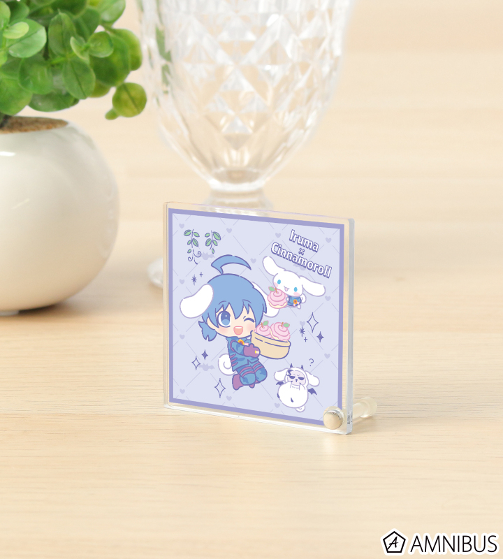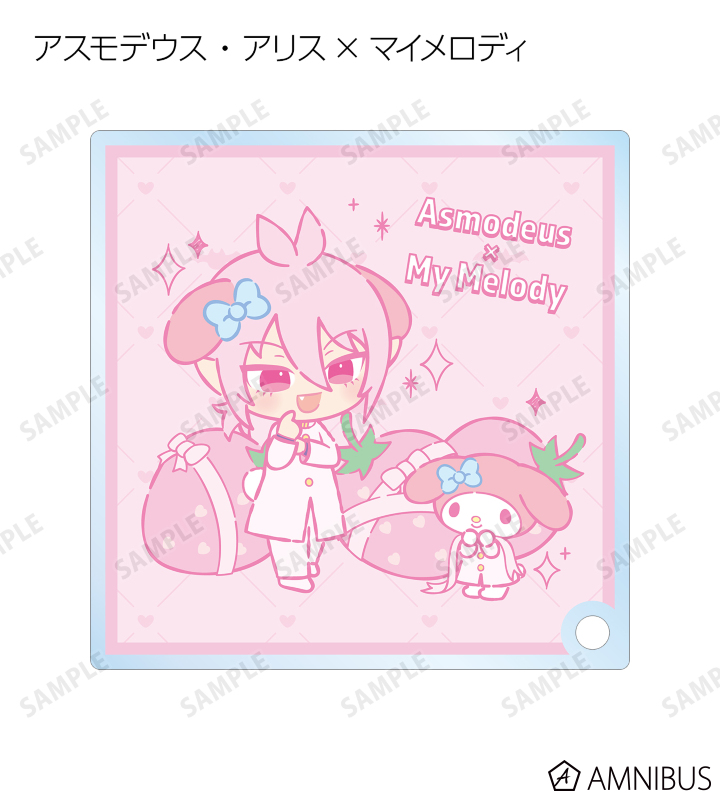 鈴木入間 ×シナモロール、アスモデウス・アリス×マイメロディ、ウァラク・クララ×ハンギョドン、アンドロ・M・ジャズ×クロミ、シャックス・リード×ポムポムプリン、オペラ×ハローキティ、ナベリウス・カルエゴ×バッドばつ丸を手のひらサイズのアクリルパネルに仕上げました。