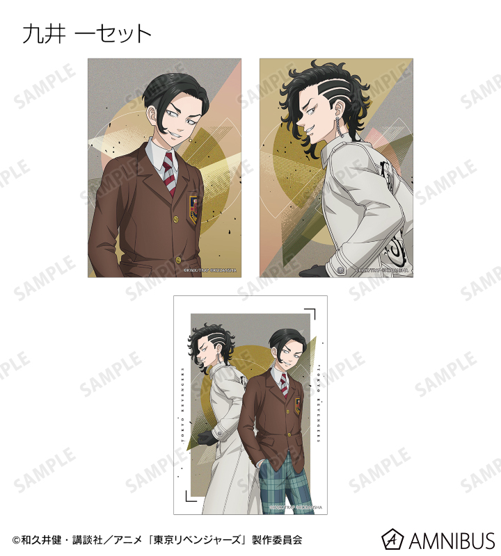 花垣 武道、佐野 万次郎、龍宮寺 堅、場地 圭介、松野 千冬、三ツ谷 隆、乾 青宗、九井 一の描き下ろしイラストをブロマイド3枚セットに仕上げました。
