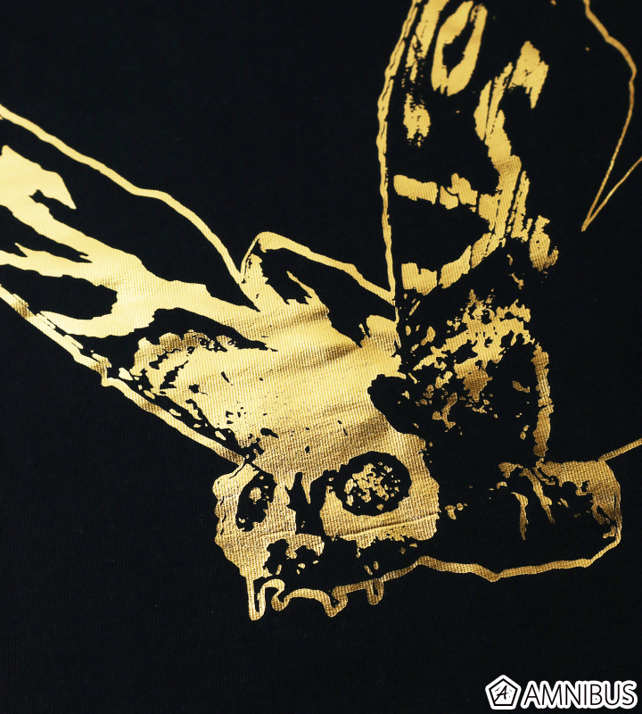 「極彩色の怪獣」とも呼ばれるモスラを、ゴールドの箔プリントで仕上げたメタリックに輝くデザインです。
