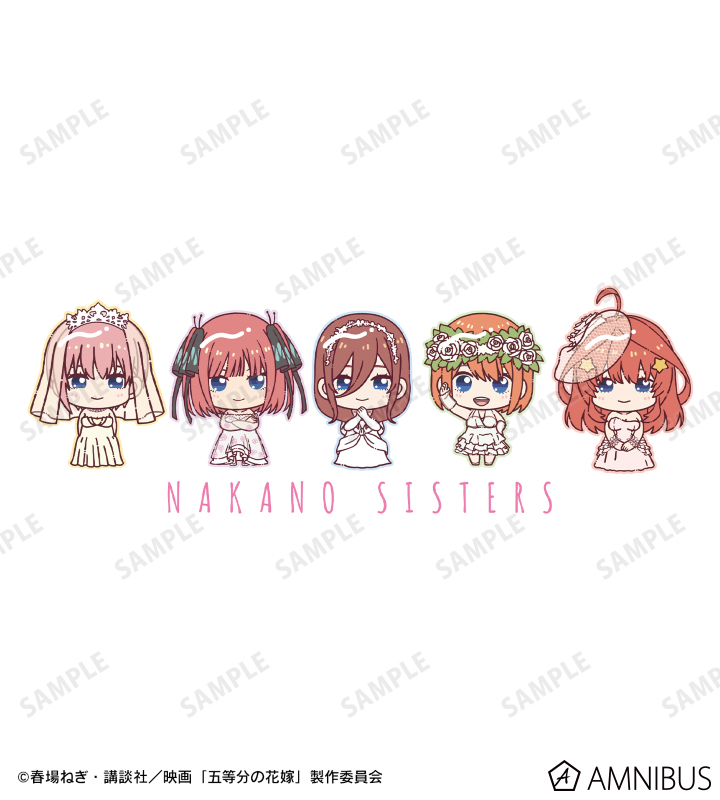 中野一花、中野二乃、中野三玖、中野四葉、中野五月がちょこんと立っているちびキャラを新たに描き起こし、Tシャツに仕上げました。