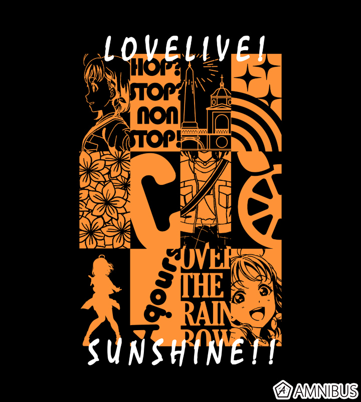 挿入歌「Hop? Stop? Nonstop!」の千歌のシルエットと線画、モチーフなどをスクエア状にフレーミングして組み合わせ、メンバーをイメージしたカラーリングで仕上げました。