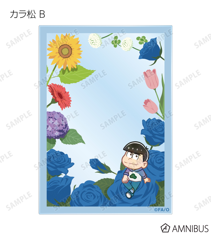 おそ松、カラ松、チョロ松、一松、十四松、トド松のイラストをボタニカルデザインに落とし込んで繊細なタッチで新たに描き起こし、アクリルカードに仕上げました。