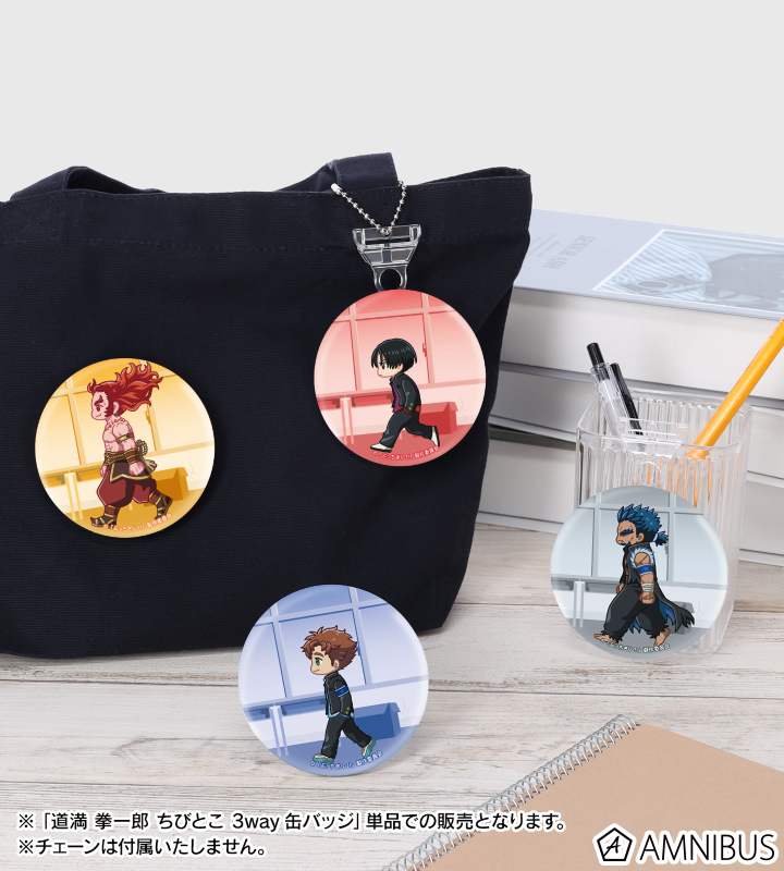道満 拳一郎が歩いているちびキャラを新たに描き起こし、3WAY缶バッジに仕上げました。