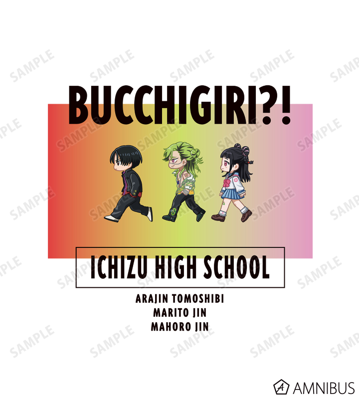灯 荒仁、神 摩利人、神 まほろが歩いているちびキャラを新たに描き起こし、高校名、作品名、キャラクター名の英字表記をTシャツにデザインしました。