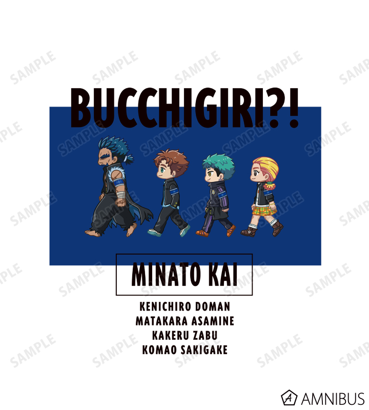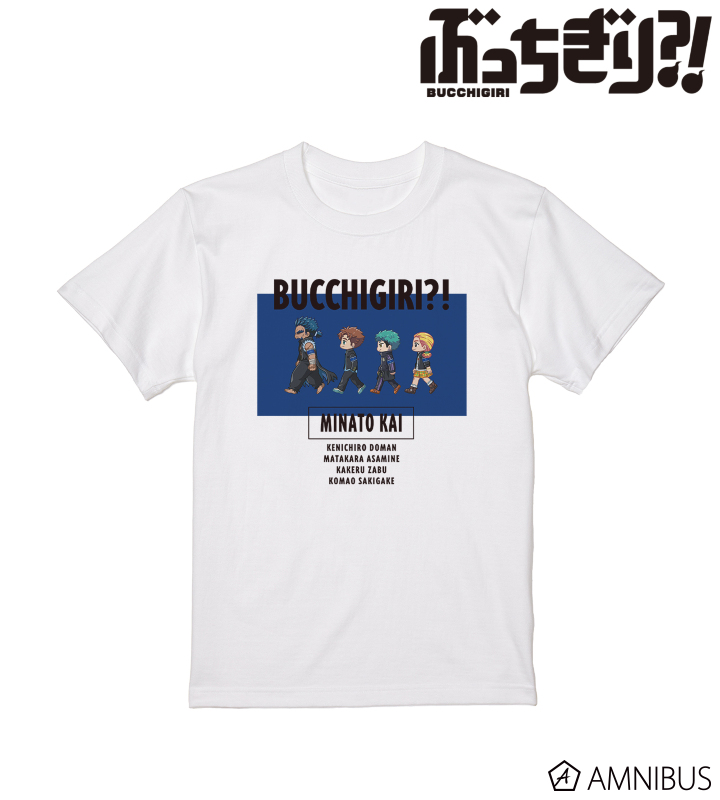 道満 拳一郎、浅観音 真宝、座布 翔、魁 駒男が歩いているちびキャラを新たに描き起こし、魅那斗會、作品名、キャラクター名の英字表記をTシャツにデザインしました。
