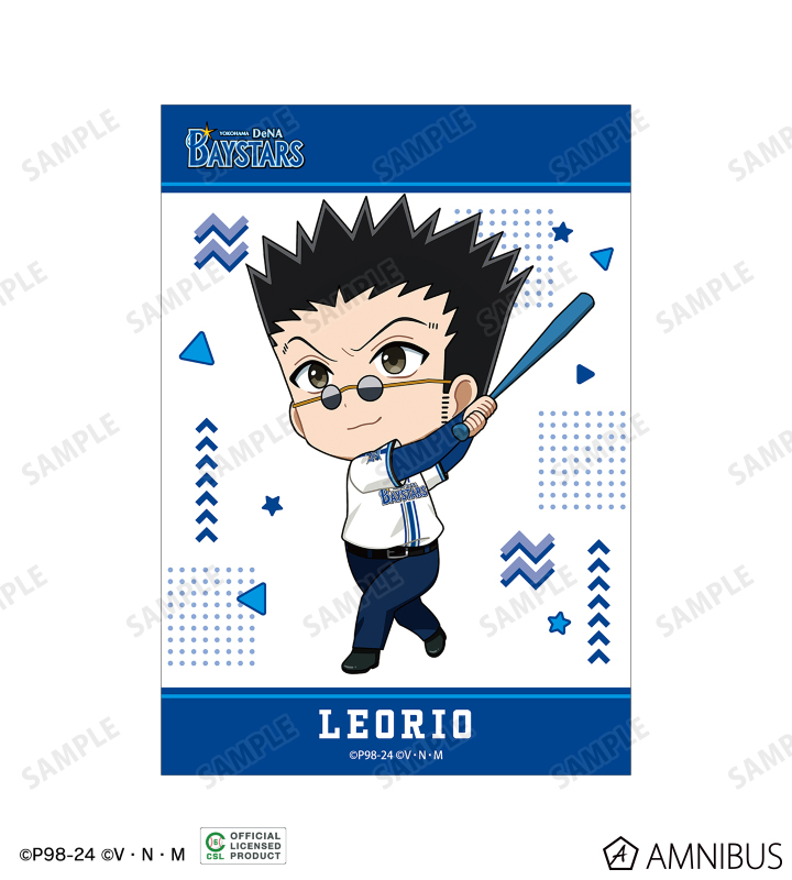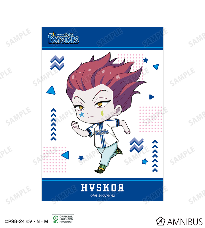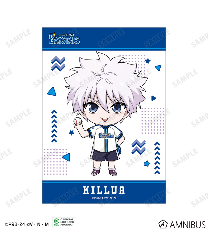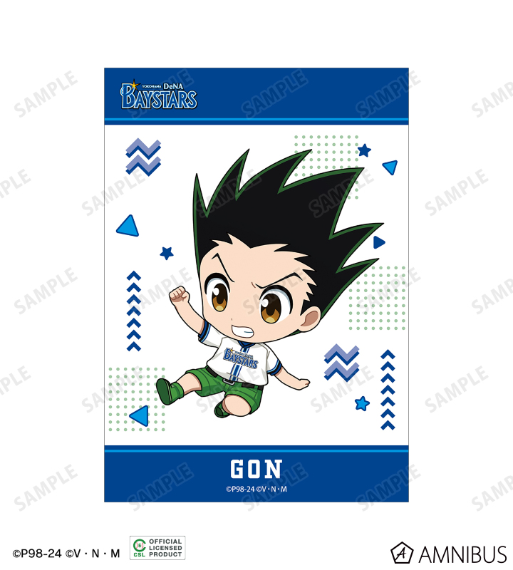 ゴン、キルア、レオリオ、クラピカ、ヒソカの描き起こしちびキャライラストと球団のロゴをチームカラーに合わせたブロマイド5枚セットに仕上げました。