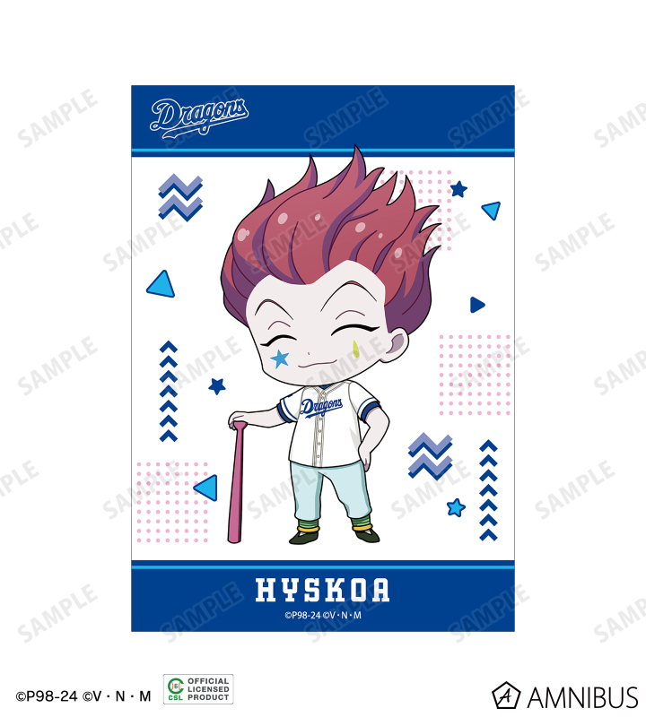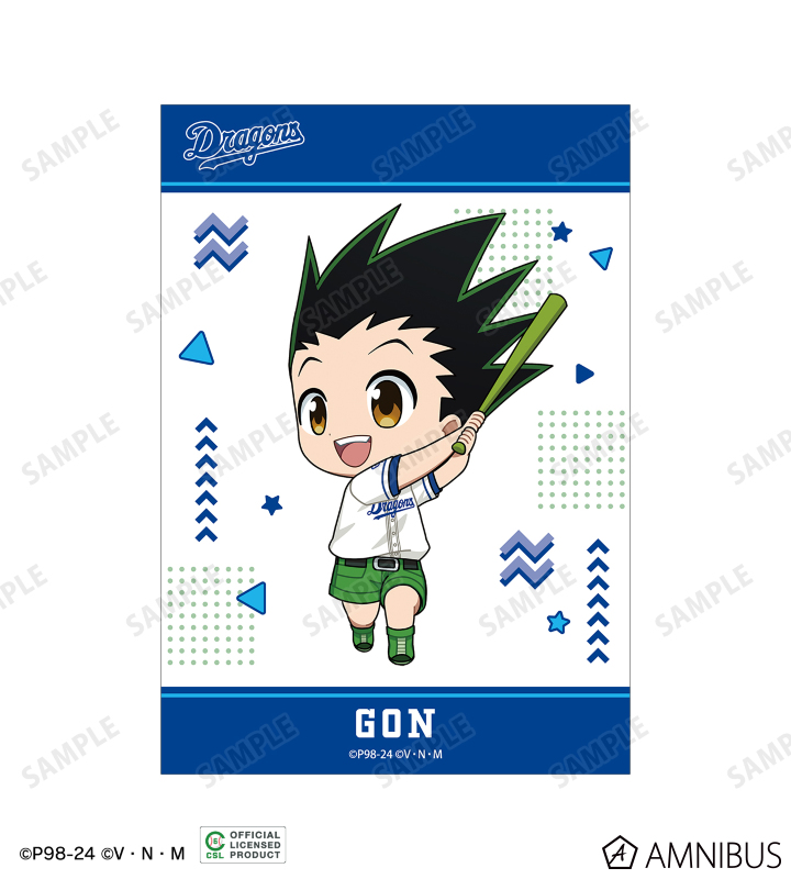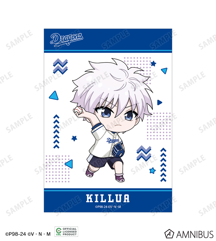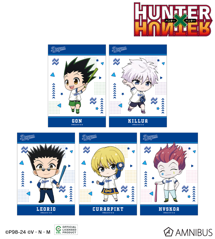 ゴン、キルア、レオリオ、クラピカ、ヒソカの描き起こしちびキャライラストと球団のロゴをチームカラーに合わせたブロマイド5枚セットに仕上げました。