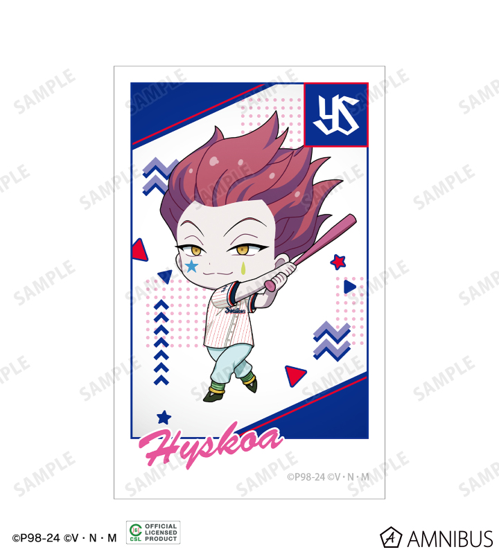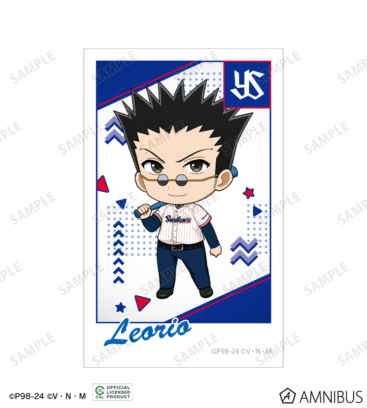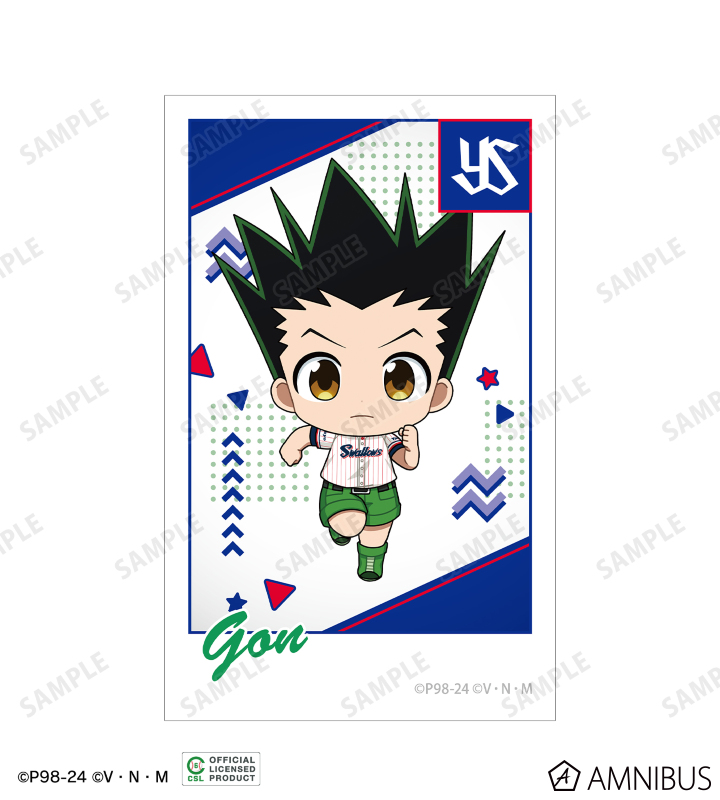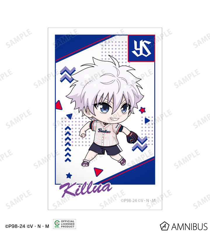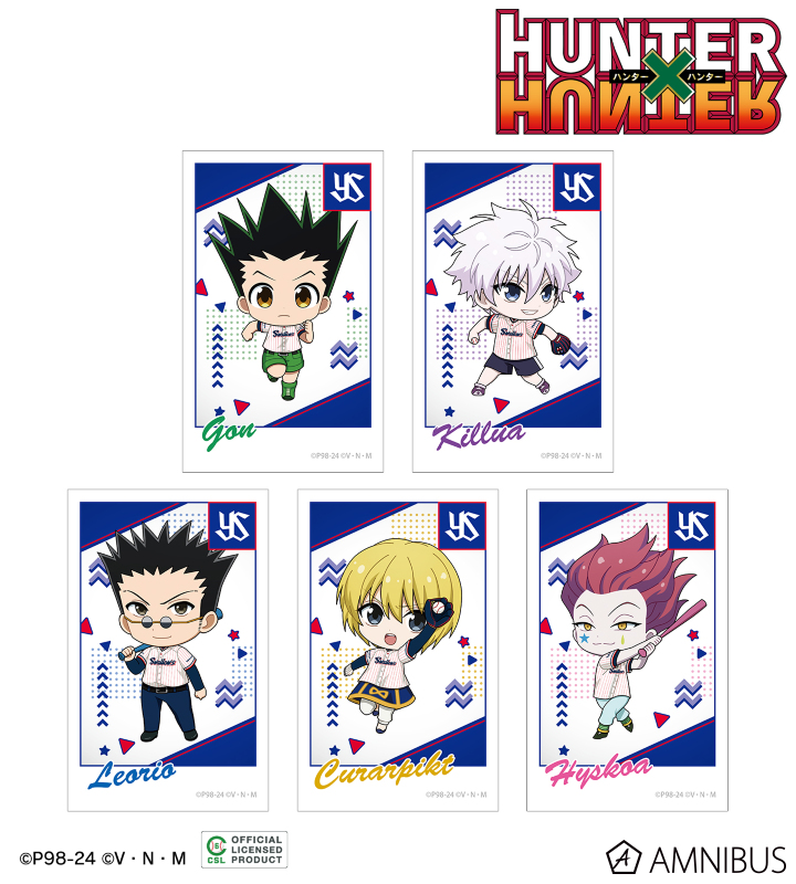 ゴン、キルア、レオリオ、クラピカ、ヒソカの描き起こしちびキャライラストと球団のロゴを、チームカラーに合わせたインスタントフィルム風のイラストカードに仕上げました。